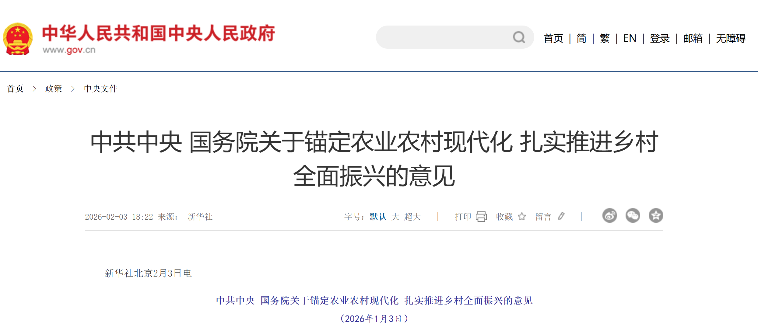 中共中央 国务院关于锚定农业农村现代化 扎实推进乡村全面振兴的意见